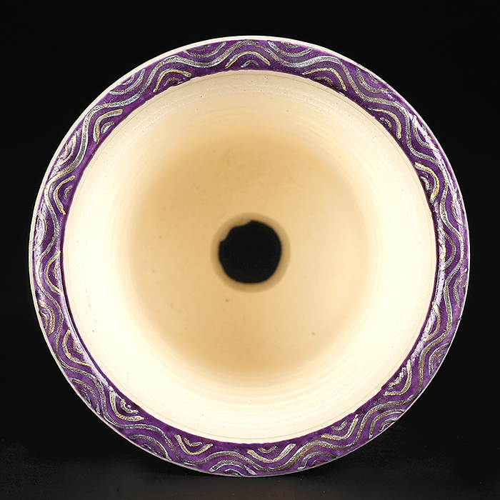 ボディ成型に関しては、以前から父親の茶陶製造を務めていたこともあり、タタラもロクロもお手の物。型を用いず完全手づくりでこなす。本焼きされた絵付け前のボディには下絵付けせず、透明釉を施釉。ベースとなる線画を描き焼成。彩色を得て焼成。そえて最終工程に金彩などによる装飾を加えて焼成と4度の窯入れを得て柳戸川浩山鉢が生み出される。