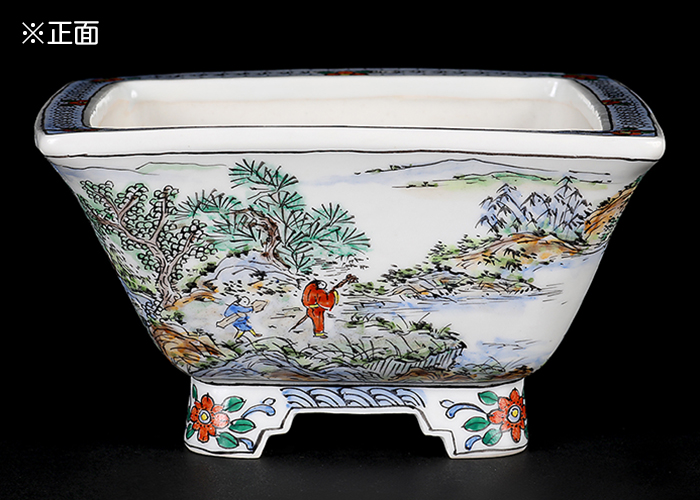 近年は小品盆栽に使える長方鉢、木瓜式鉢などを中心に作陶。また得意のロクロ成型からの削り出しによる六角型の輪花縁といったオリジナルデザインも生み出しています。絵付けは涌泉が用いた山水や雲龍図などをベースにしていますが、五彩などは技術の向上により正泉独自の色彩を表現、国内のみならず海外でも高い人気を誇ります。