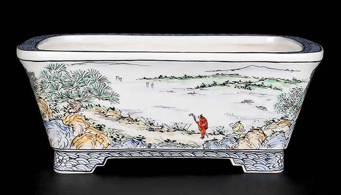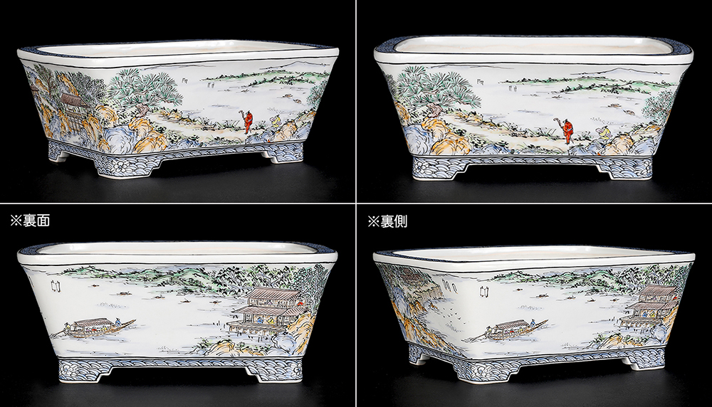 柔らかで深さのある長方鉢。サイズも良く、小品盆栽に幅広く使えます。しっかり書き込んだ部分と余白部分とのメリハリが利いた絵付けで、友の元を訪れる高士、そして水辺の景色が上手く調和した抜群の仕上がり井です。落款:月之輪正泉