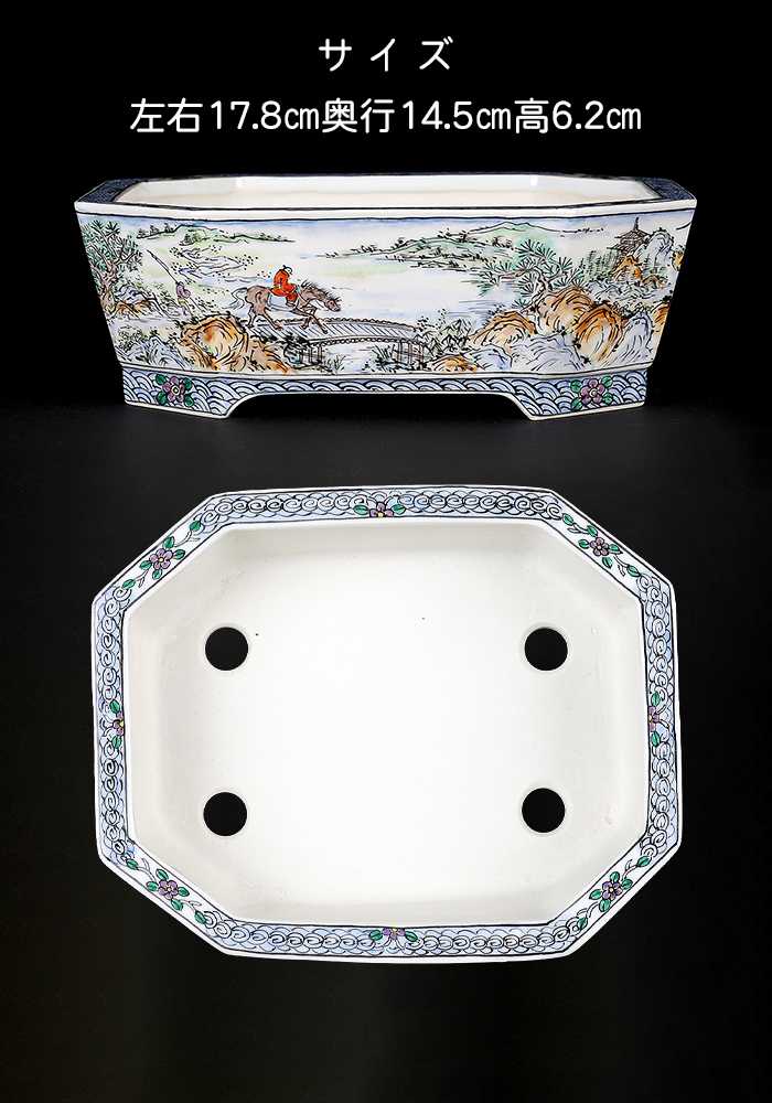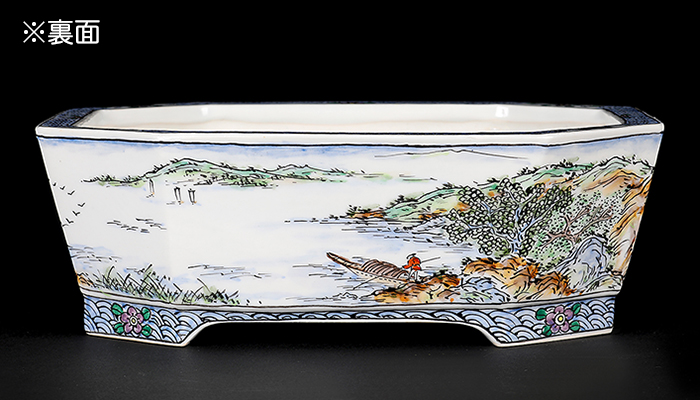 隅切のカッチリとした型で存在感抜群の長方鉢。友の元を訪ねる高士を描いた訪友図ですが四面をフルに活かした廻し絵は圧巻の一言。涌泉を彷彿させる色使い、奥行感のある雄大な景色と素晴らしい仕上がりです。落款:月之輪正泉