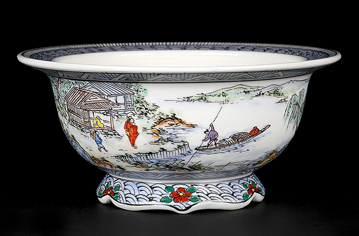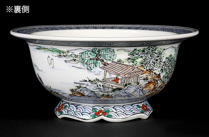 近年は小品盆栽に使える長方鉢、木瓜式鉢などを中心に作陶。また得意のロクロ成型からの削り出しによる六角型の輪花縁といったオリジナルデザインも生み出しています。絵付けは涌泉が用いた山水や雲龍図などをベースにしていますが、五彩などは技術の向上により正泉独自の色彩を表現、国内のみならず海外でも高い人気を誇ります。