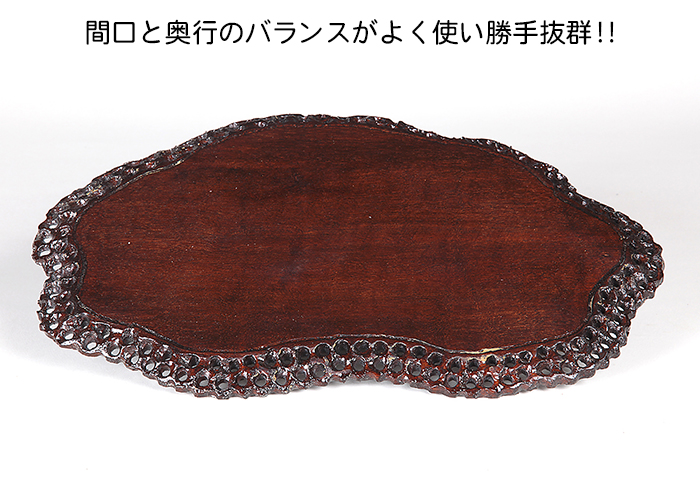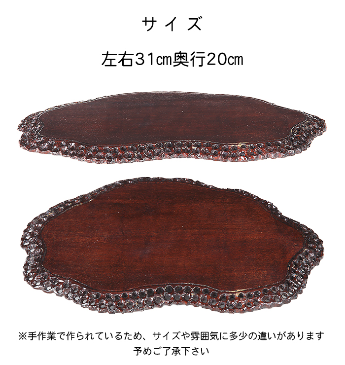 小品盆栽から貴風サイズまで使える貴重なサイズの地板です。材を足し合わせて天然彫りのような風合いに仕上げています。間口と奥行きのバランスが良く、使い勝手抜群です。手作業で作られているため、若干のサイズ違いや塗装のムラなどがありますが、使用には問題ありません。しかしそれゆえのお手頃価格でご紹介致します。お気に入りの盆栽や山野草を素敵に飾って下さい。