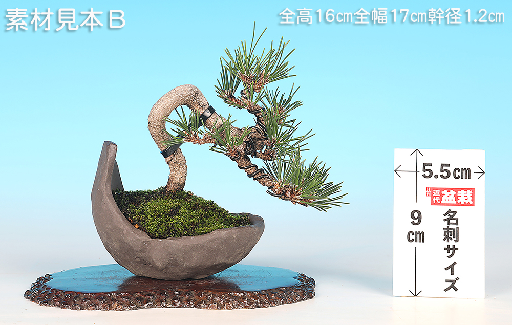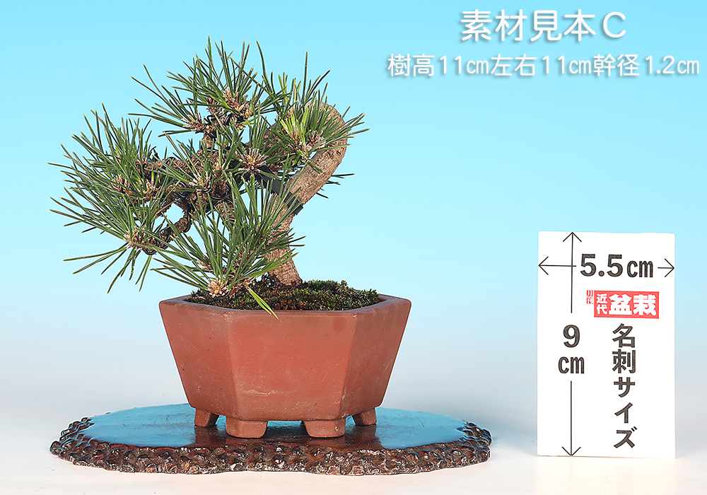 太短い濃緑葉で、芽が密に出る八ッ房黒松の人気品種です。しっかりと模様の入った黒松の幹に千寿丸の芽が接がれた面白い樹形で、玄関などちょっとしたスペースで飾り映えしそうです。