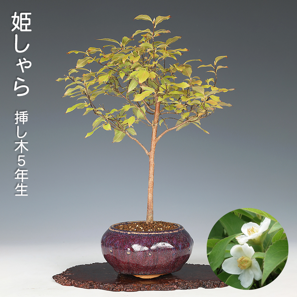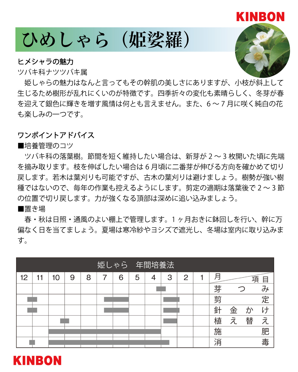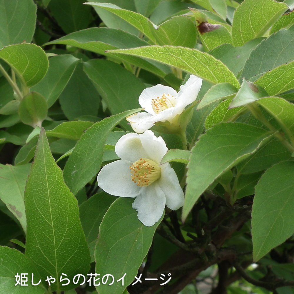 姫しゃらの魅力はなんと言ってもその幹肌の美しさにありますが、小枝が斜上して生じるため樹形が乱れにくいのが特徴です。四季折々の変化も素晴らしく、冬芽が春を迎えて銀色に輝きを増す風情は何とも言えません。また、6~7月に咲く純白の花も楽しみの一つです。
