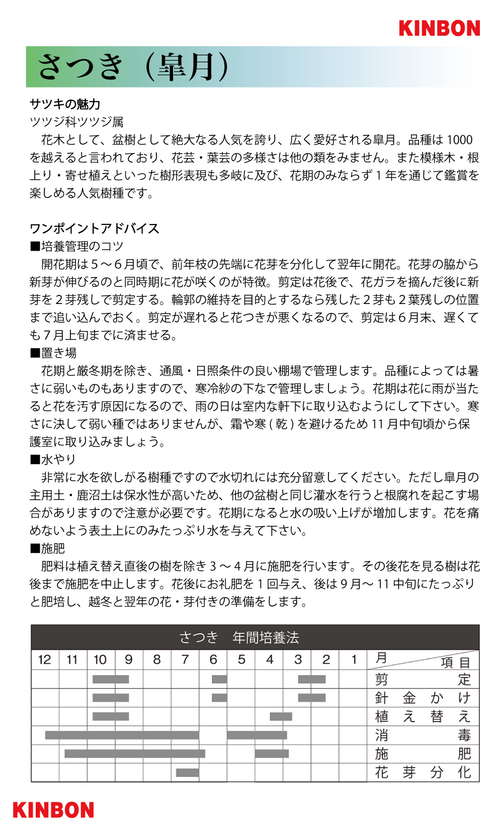 非常に水を欲しがる樹種ですので水切れには充分留意してください。ただし皐月の主用土・鹿沼土は保水性が高いため、他の盆樹と同じ灌水を行うと根腐れを起こす場合がありますので注意が必要です。花期になると水の吸い上げが増加します。花を痛めないよう表土上にのみたっぷり水を与えて下さい。