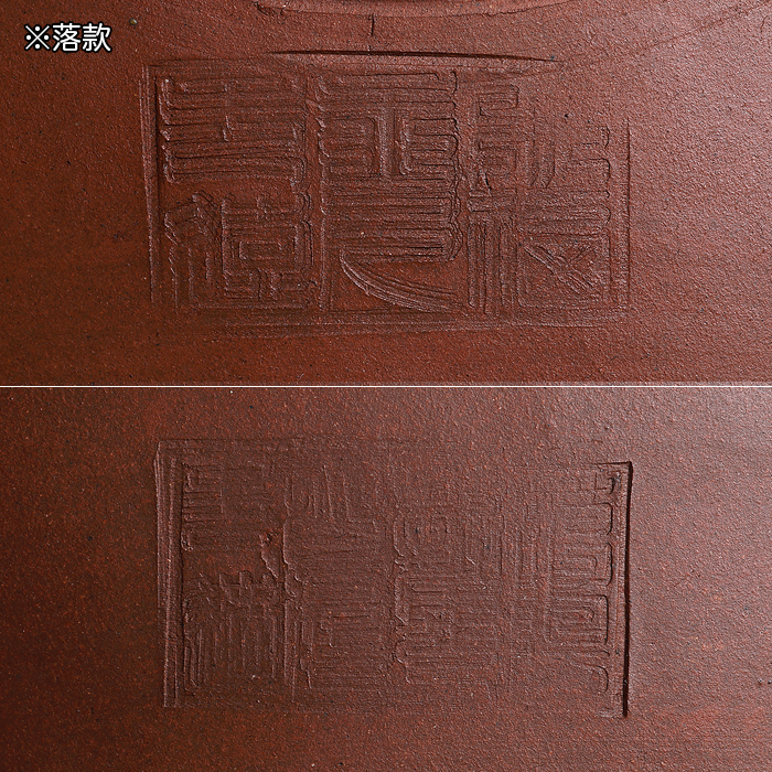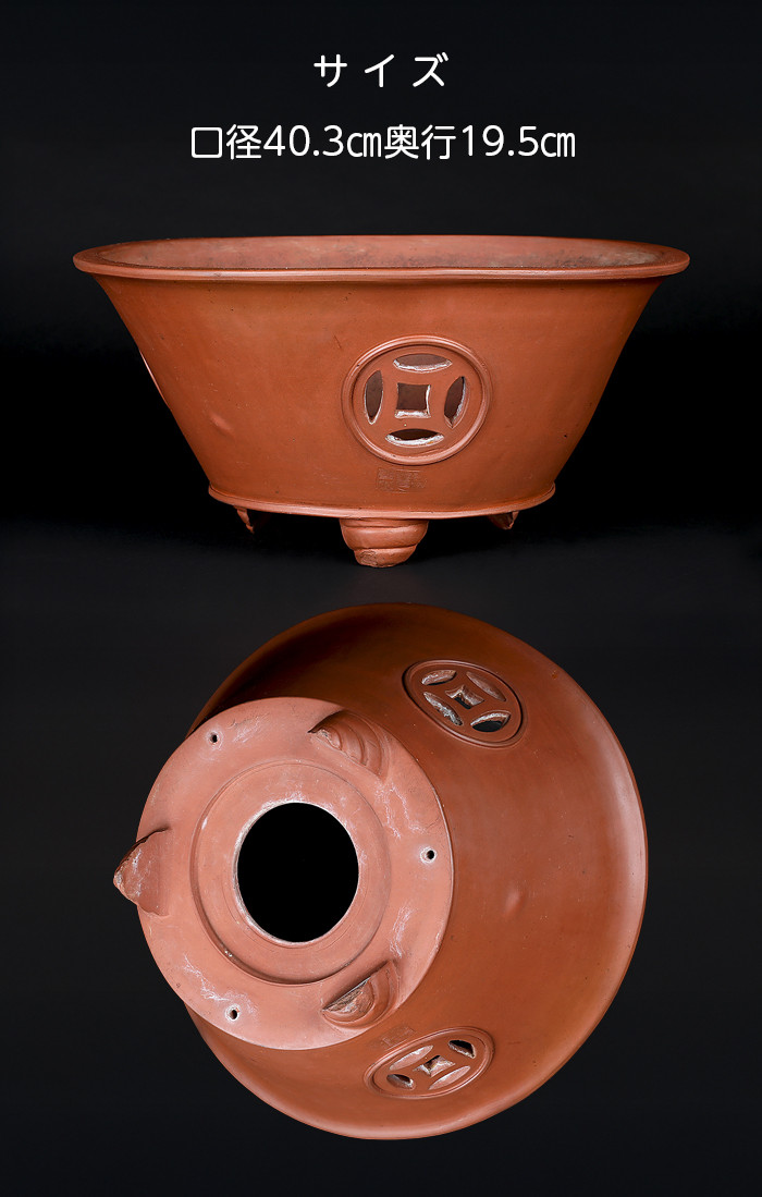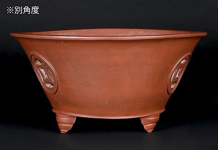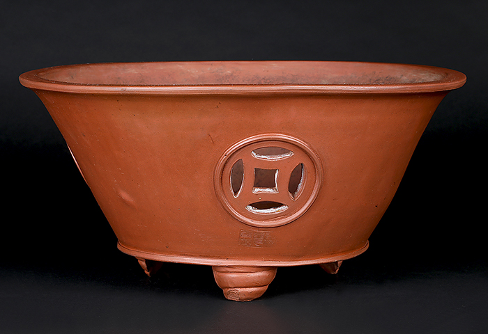 著名愛好家が40年以上前に中国・宜興にて特注で作らせたという貴重品。滑らかな朱泥の土目に透彫の文様が入った気品溢れる仕上がりです。足の形状にもこだわりが見て取れるデザイン性に富んだ作品です。使い込みによる時代感も申し分ない逸品。シャモットの飛びやヘラ痕、火膨れの他、足にホツレはありますが使用には問題ありません。落款あり