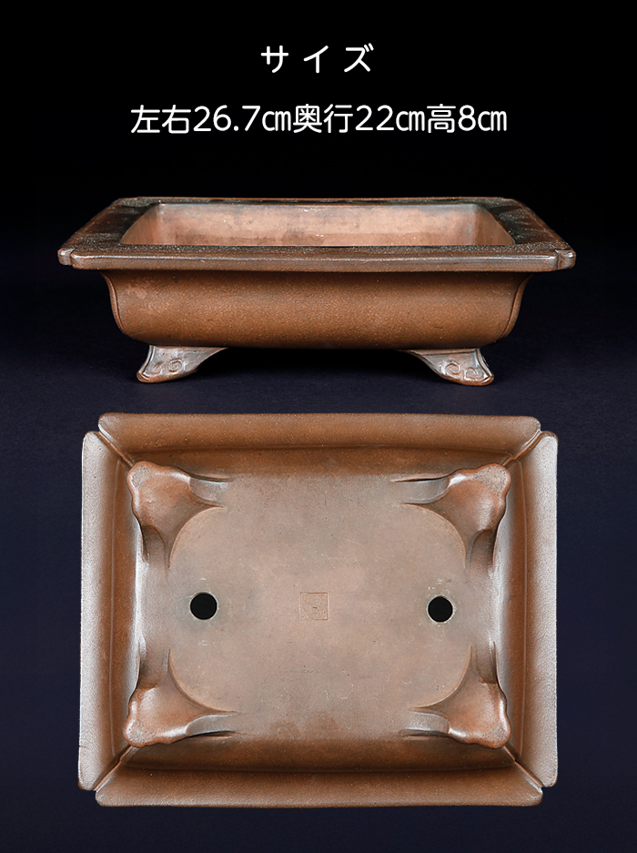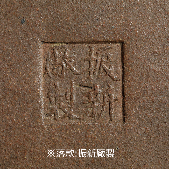 子林古型と言われる、どっしりとした型と格調高いデザインは振新厰製の定番ですが、深さを抑えたこのデザインは大変珍しい。中品鉢が多いこの手の鉢で貴風クラスの小振りなサイズも大変希少。きめ細かな土目にチョコレート色の土色が美しく、その上から抜群の時代乗りを見せる逸品。まさに実用名鉢と言えるでしょう。目立った傷はなく保存状態は良好。落款:振新厰製