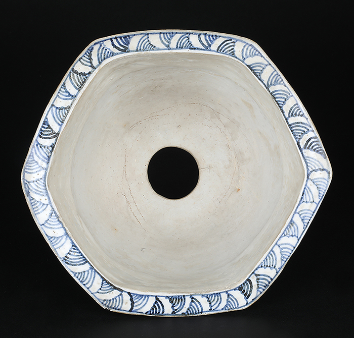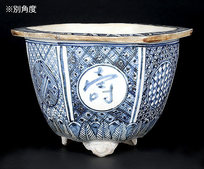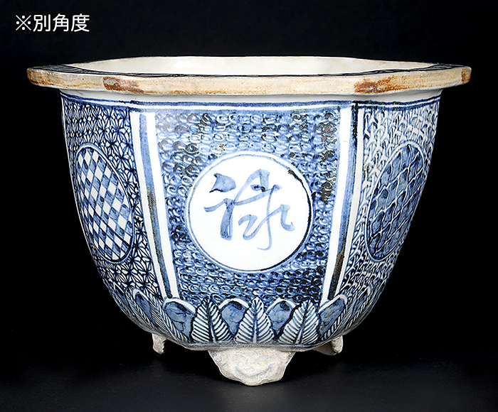 落款が入っているが判読が難しく、陶工や窯元などの詳細は不明。おそらくは100年以上前に焼成された京焼と思われます。細やかな文様と吉祥文字の意匠が上品な仕上がりを見せ、時代乗りも申し分ありません。使い勝手の良い寸法も魅力。角や足に小さなホツレと足の付け根にカマ傷ありますが古さを考えれば保存状態は良好です。落款あり。