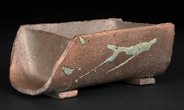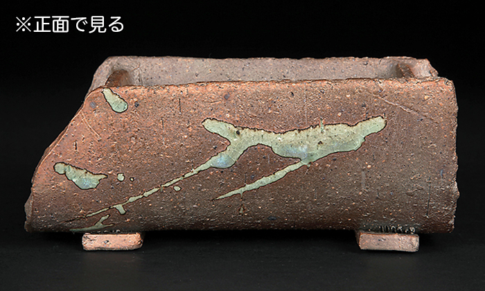 竹筒を半分に割ったような形状が面白い作品。緑釉を筆で垂らしたような意匠が一層味わいを深めています。草物や盆栽の寄せ植えに最適です。落款:片