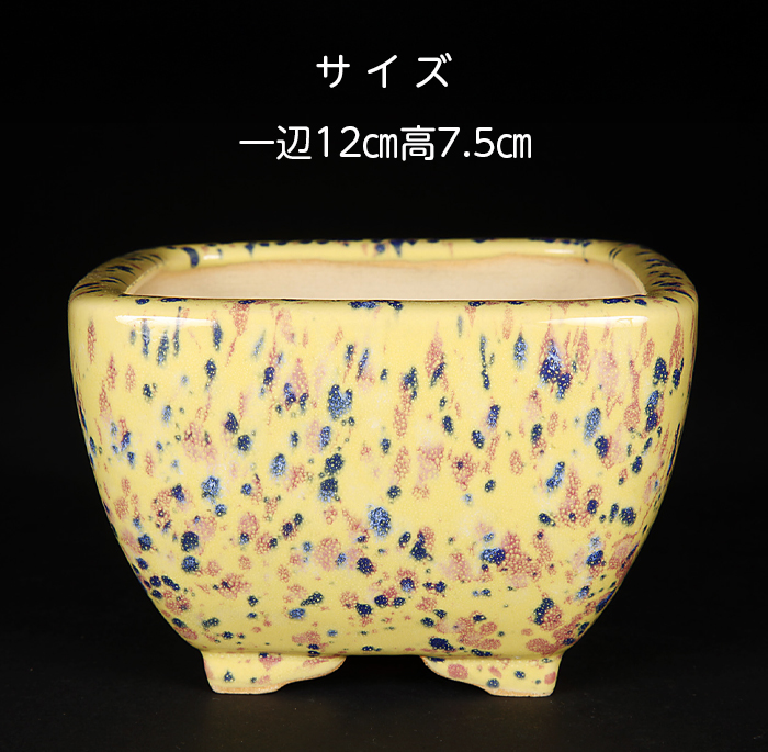 幅広い型・釉薬を手掛け、渋い色合いや窯変に定評があり、戦後の小品盆栽ブームを支えた燿山。燿山の没後、子息の英明が燿山の型・釉薬を継承して作りあげた「耀山窯英明」。燿山の技を引き継ぎつつも斬新な釉薬鉢も手掛ける英明。その英明の技術の粋を尽くした新作。独特の斑紋に浮き出た結晶釉が味わい深い作品です。黄釉をベースに様々な色の結晶が独特の世界感を見せる逸品。人気の正方型で本格的な小品盆栽に使えるサイズ感も魅力。落款:燿山窯・英明