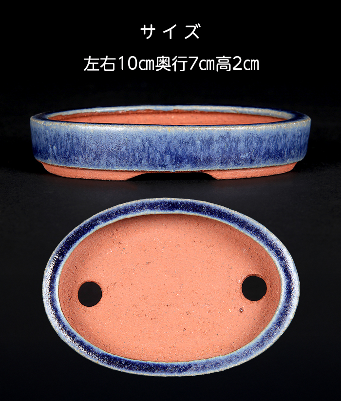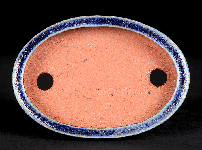 燿山譲りのマット(テカリを抑えた発色)系の瑠璃釉は渋みがあり、落ち着いた仕上がりを見せています。白の斑紋が浮かぶ窯変は味わい豊かです。オーソドックスな型だけに使い勝手は抜群。小品盆栽・ミニ盆栽に最適です。