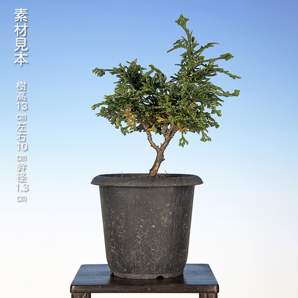 津山桧は普通種に比べて芽吹きが良く芽の伸びも短い八ッ房性品種です。年数が若く、幹が細いので複数をまとめて寄せ植えに仕立てることで、大きな林景を楽しめます。プラ鉢入り。