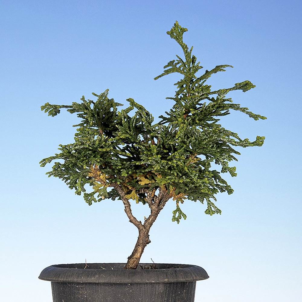 盆栽としての樹形は直幹が多いですが、模様木、斜幹、懸崖なども見られます。小品盆栽としては、普通種より石化桧をはじめとする八ツ房品種が適しています。矮小で葉も細かく、樹皮も早くから荒れるのが特徴です。