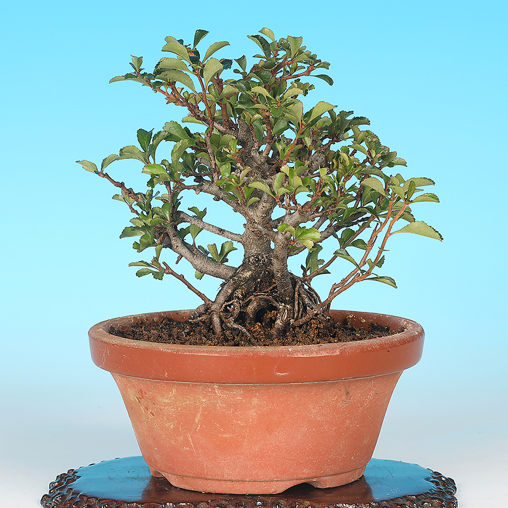 四季咲き性で冬場に花が楽しめる矮性の木瓜の仲間です。可憐で品のある花の美しさと、持ち込むことで時代が乗る幹は、他の樹種にはない独特の渋さがあります。冬場の飾りに色を添える盆栽には欠かせない樹種です。