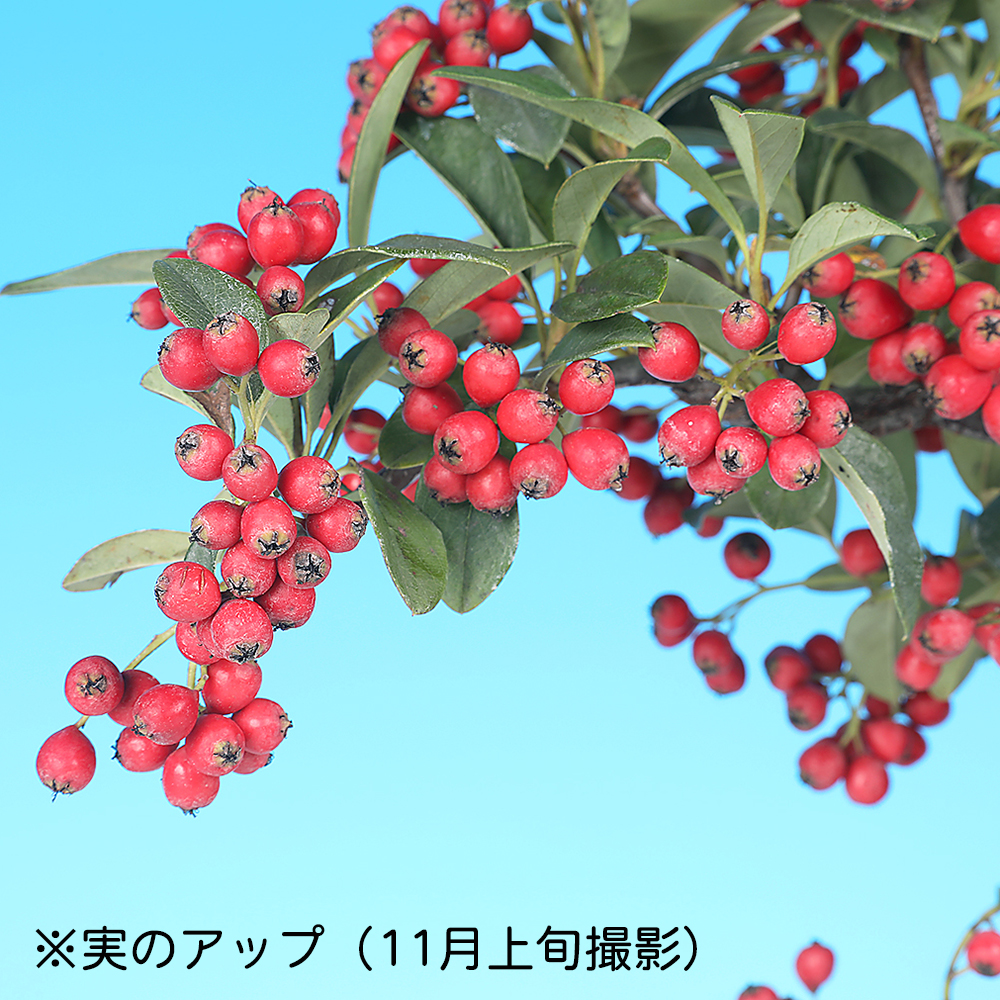 5月から6月頃に小さな紅色もしくは白花を咲かせ、実は小粒の球形。秋に熟して真紅に染まります。同属で盆栽素材として人気の高いベニシタンよりも果実は大きく、派手やかな印象です。樹性は極めて強健で萌芽力も強く、花が咲けば、ほぼ確実に実を結ぶので花物・実物盆栽の入門樹種として最適です。