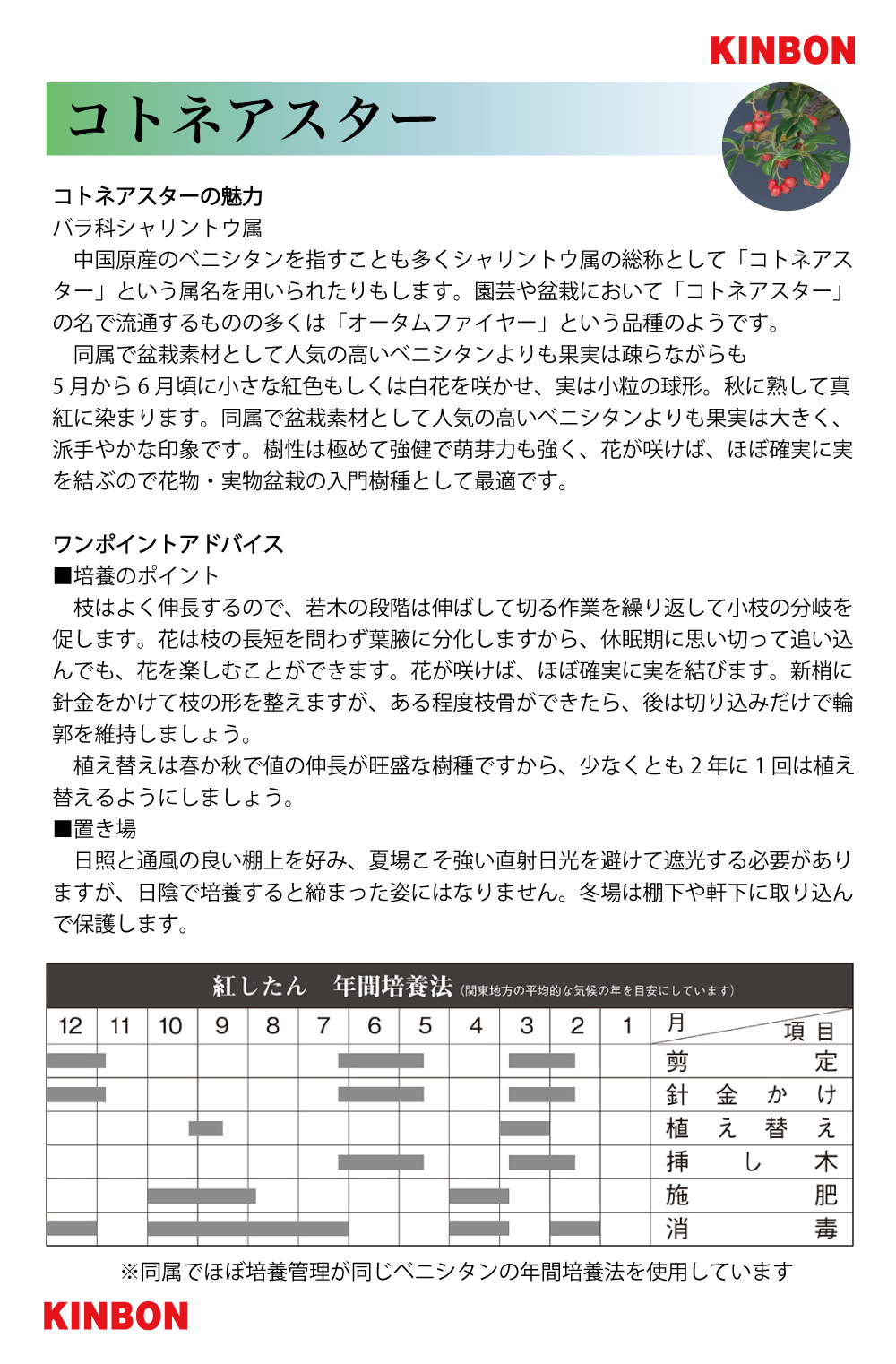 中国原産のベニシタンを指すことも多くシャリントウ属の総称として「コトネアスター」という属名を用いられたりもします。園芸や盆栽において「コトネアスター」の名で流通するものの多くは「オータムファイヤー」という品種のようです。