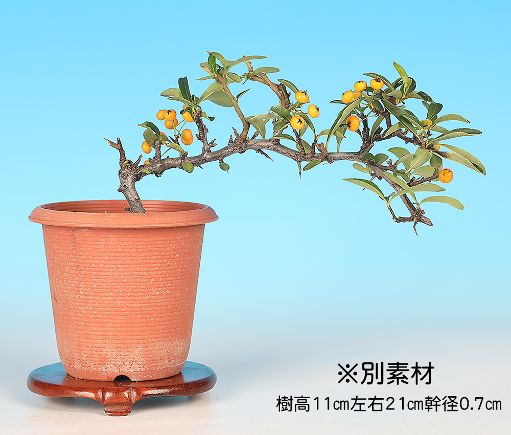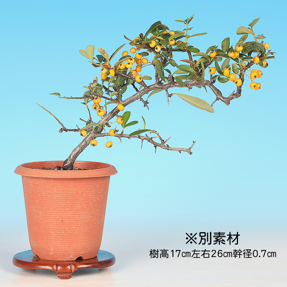 挿し木からしっかりと幹に模様をつけられた黄実のピラカンサです。枝位置もきちんと考えられており、今後の樹づくりが楽な素材です。プラ鉢入。