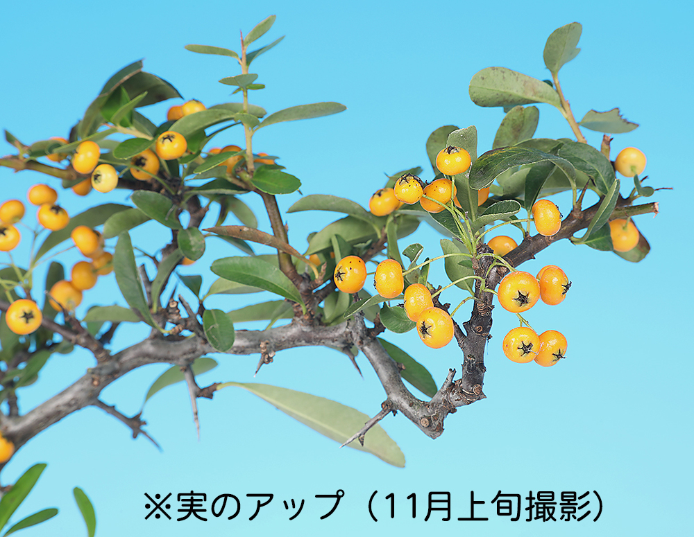 バラ科の常緑低木。実色が濃紅色のトキワサンザシと黄橙色のタチバナモドキの2種が一般的です。強健種で育てやすく、自然交配により容易に実成りが楽しめることから人気の高い樹種の一つです。