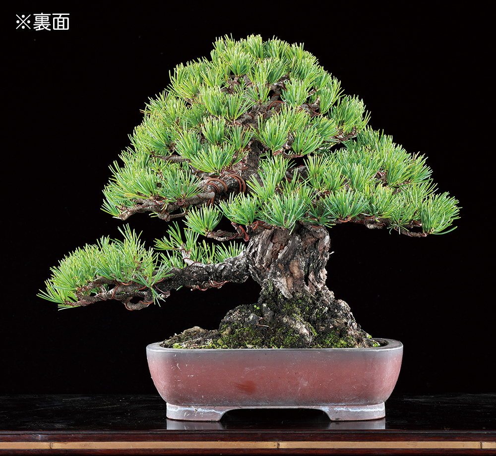五葉松「桃山」は那須系の品種とされ、深青緑色の鮮やかな葉色と、短く締まった葉性の良さが魅力である。小品〜貴風クラスの寸法でこれほどの古色と時代感を有する樹は貴重。低い位置から出る一の枝と樹冠部とのバランスも素晴らしく、貴風飾りの主木や、中品飾りの添えとして大舞台に挑戦することも夢ではない。