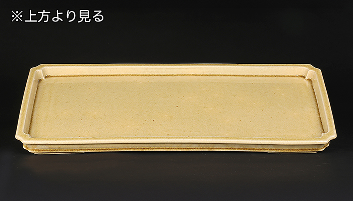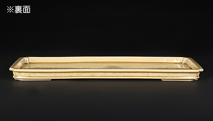 鮮やかな黄瀬戸釉の色彩が美しい水盤。間口が広い短冊型の形状で、遠山石など雄大な景色を表現する水石と合わせるとよく映える。裏薬を施された逸品。内側に小さな薬カマあり。共箱付。落款:九輪自造