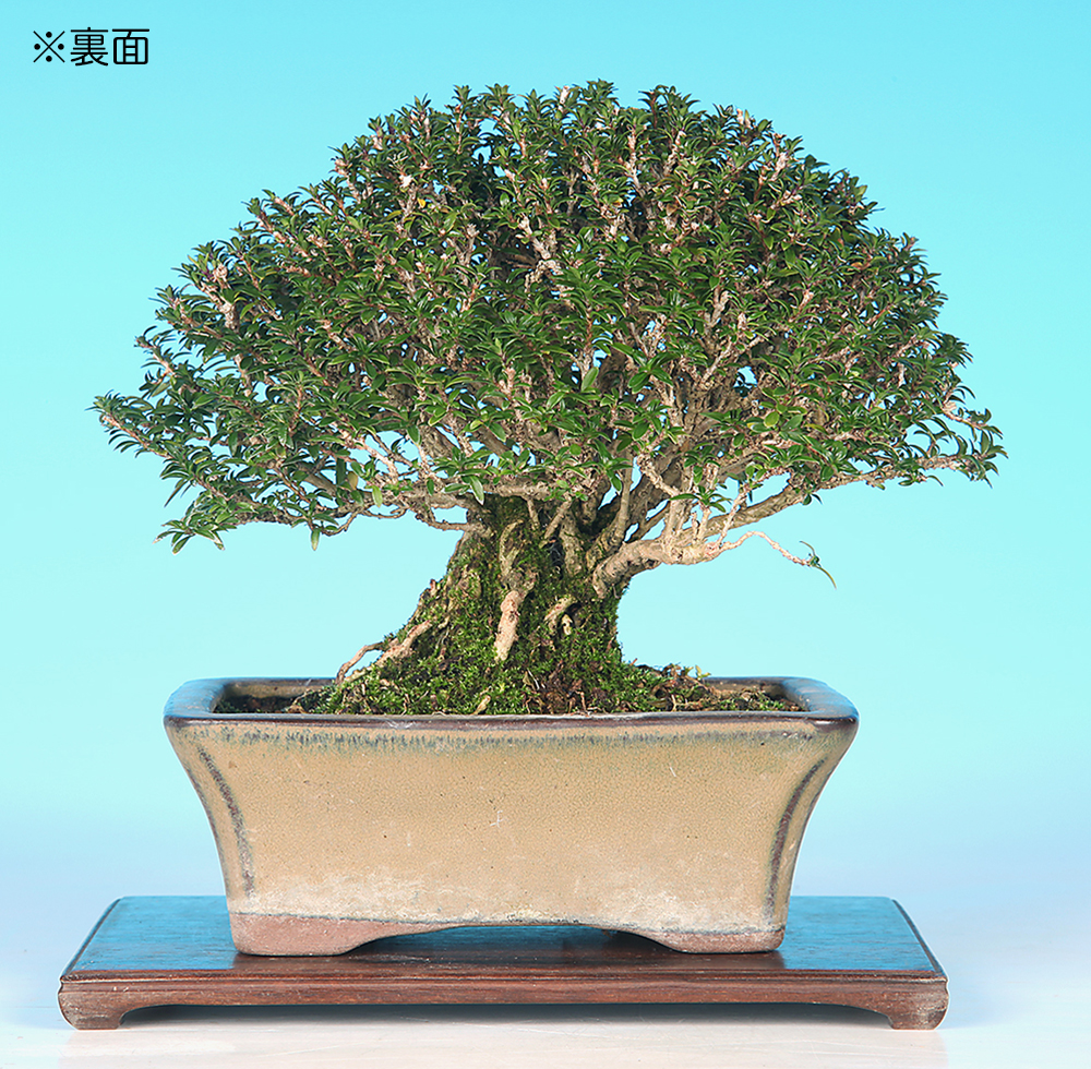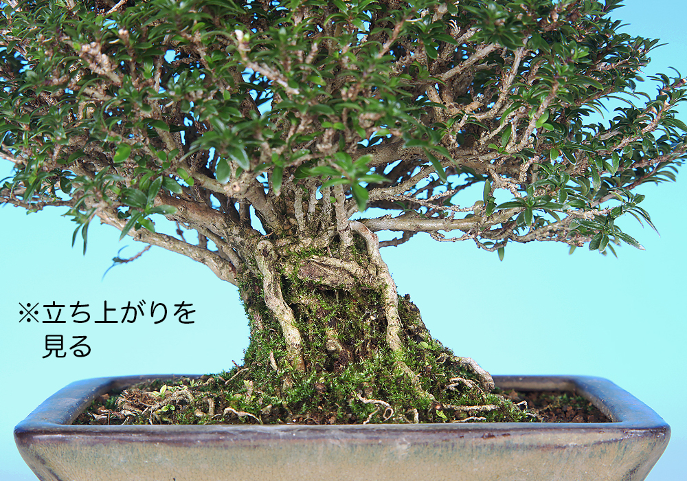 香丁木は盆栽界の名称で、一般にはハクチョウゲで流通し、初夏に淡い紫色を帯びた小さな白花を咲かせる。掴み寄せのような形状の立ち上がりが面白く、花が咲けばすぐにでも鑑賞できる仕上がり。