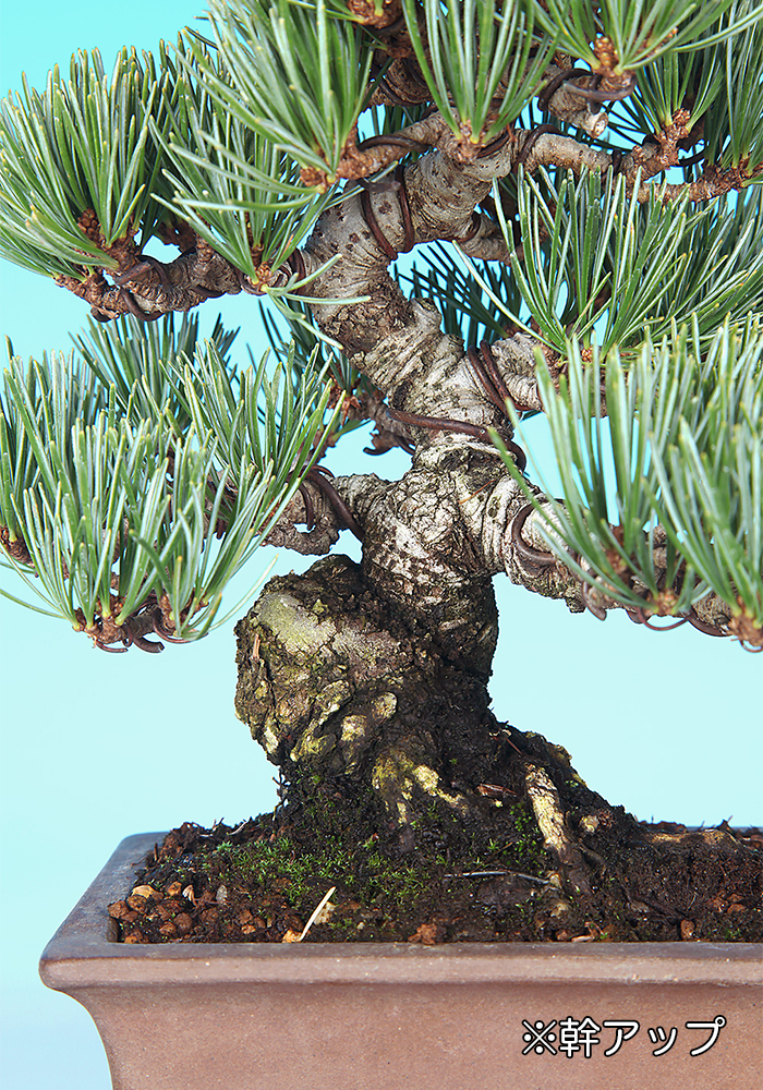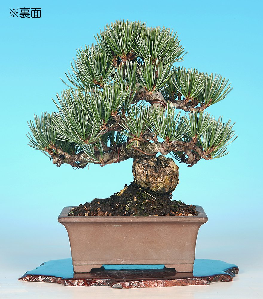 力強い立ち上がりの安定感を活かした模様木仕立て。幹肌の古色と大きく入った幹模様が見所となっている。短く伸び止まり、鮮やかな緑葉をたたえる葉性の美しさも魅力の逸品。