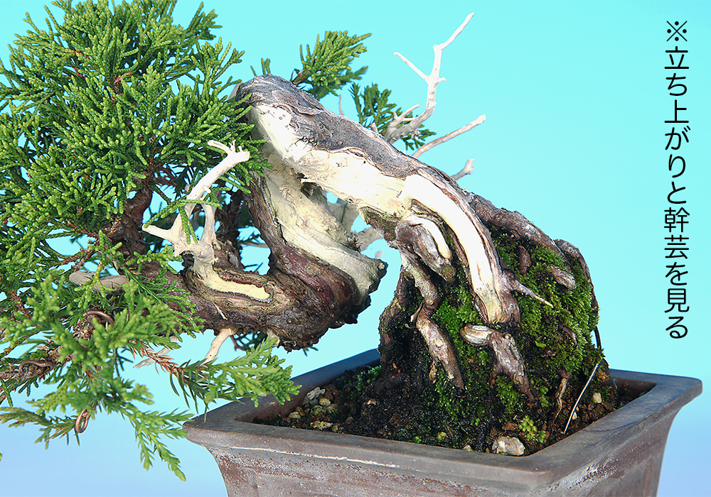 植え付け角度の変更でせり上がったと思われる立ち上がりが野趣を感じさせる。上部で屈曲するシャリ幹も迫力があり、厳しい自生環境に生きる真柏の生命力の強さが再現された逸品。
