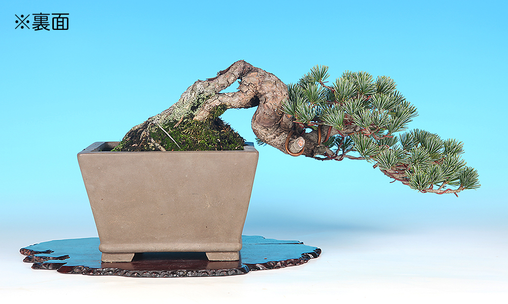 せり上がった根芸にまで時代が乗っており、懸崖樹形独特の厳しさを見所とする五葉松。短く締まった葉性の美しさも魅力である。