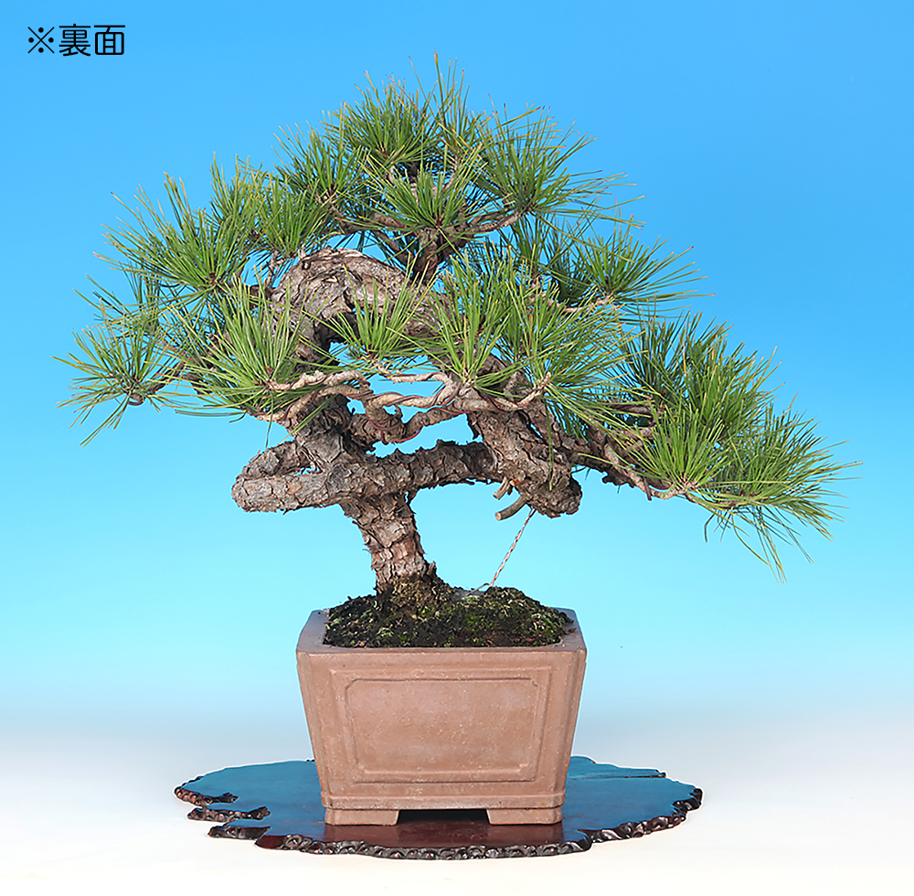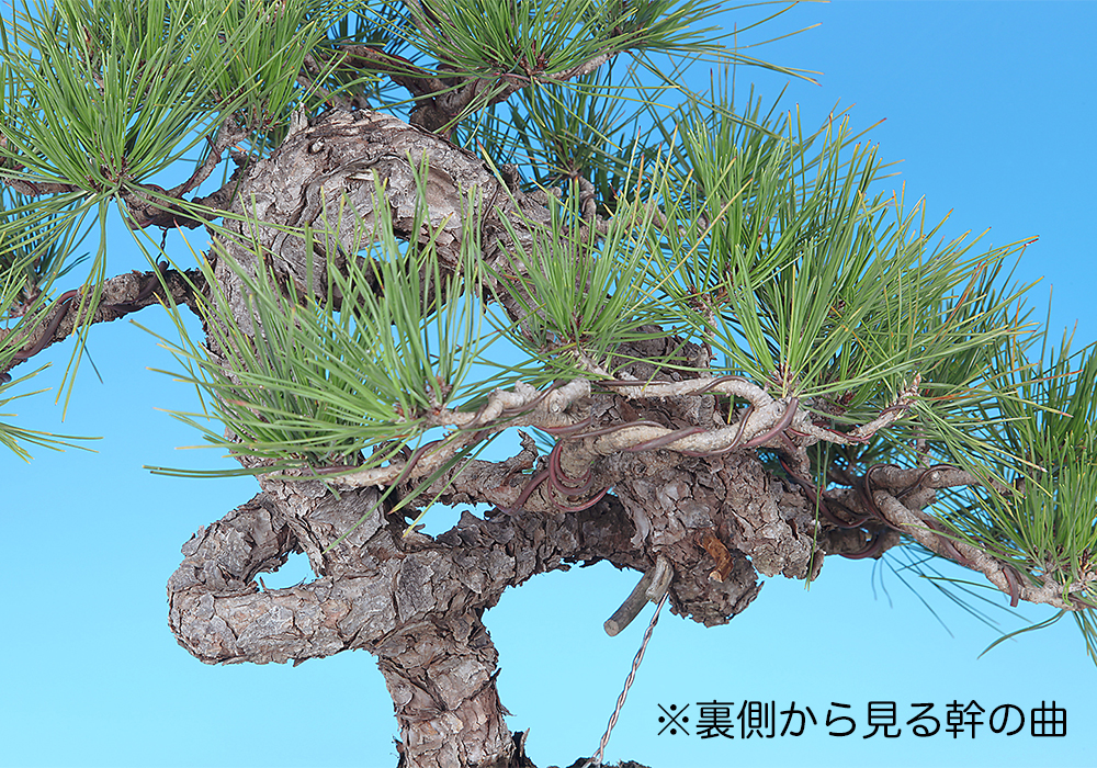 大きくループする幹模様が個性的な赤松。現状は幹模様に添わせて枝を置いて模様木樹形にまとめられているが、樹形構想次第ではさらなる樹格向上も期待できる。