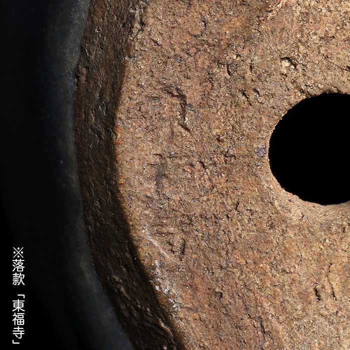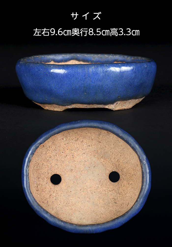 本器のような手捻りによるざっくりとした形成が温かみを漂わせ、樹を植栽した時に抜群の鉢映りを見せるのが東福寺盆器の魅力です。瑠璃釉の深みのある色合いに使い込みによる古色感が相まって抜群の味わいを見せる逸品。奥行があるので小品、ミニ盆栽はもちろん、草物にも最適です。目立った傷はなく保存状態は良好。落款:東福寺