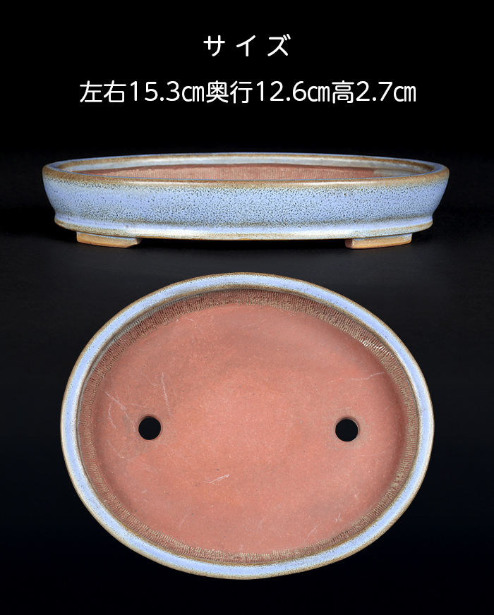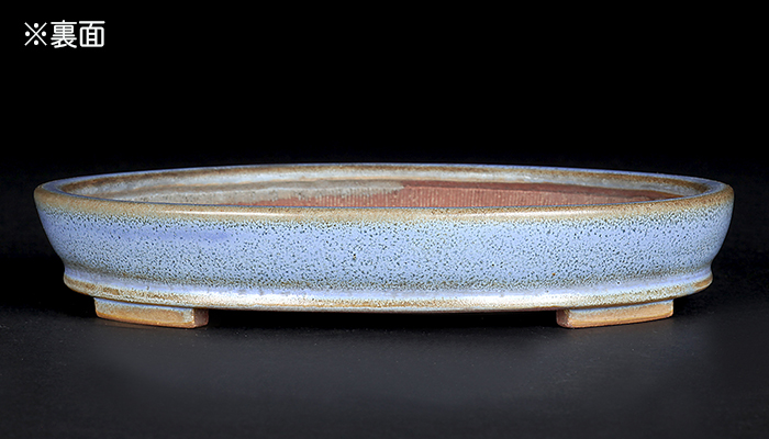 均釉は香山がこだわった釉薬の一つ。吹墨の手法で釉掛けされたものか、呂均釉のような釉紋が浮かび上がった美しい作品です。シャープなデザインはカミソリ香山の異名通りの仕上がり。浅手で奥行が広く取られた形状は根張りのある雑木盆栽に最適です。目立った傷はなく保存状態は良好。落款:平安香山