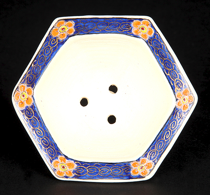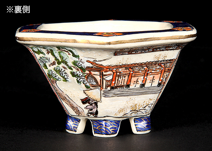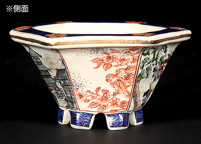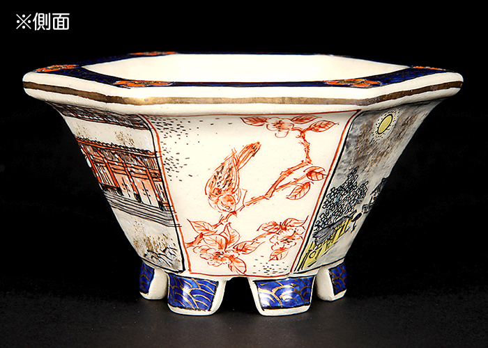六面のうち、二面を使った風景描写が表裏に時施されており、残る二面は赤絵花鳥図という構成。ミニ盆栽の他、下草使いにも最適。