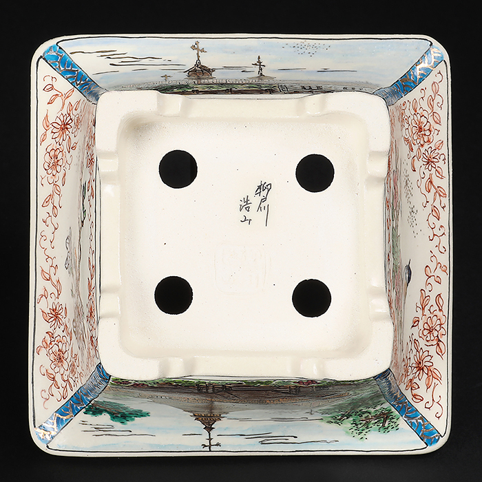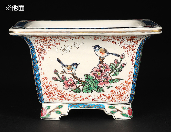盆栽鉢には珍しい西洋の風景が描写された作品。伝統的な花鳥図も二面に描かれており、樹に合わせて使い分けが可能。
