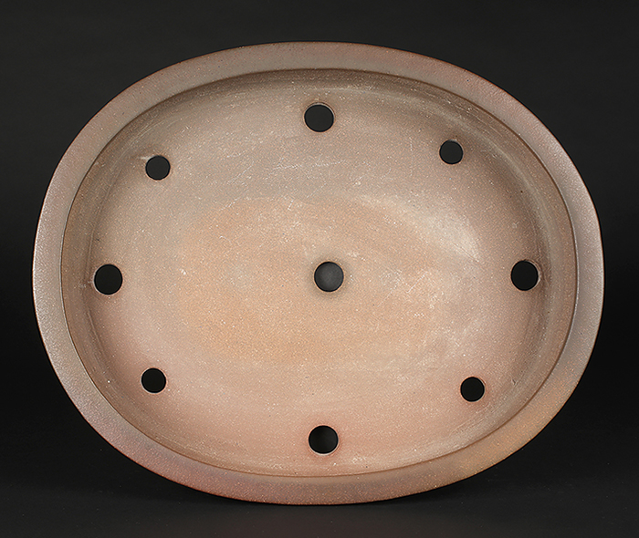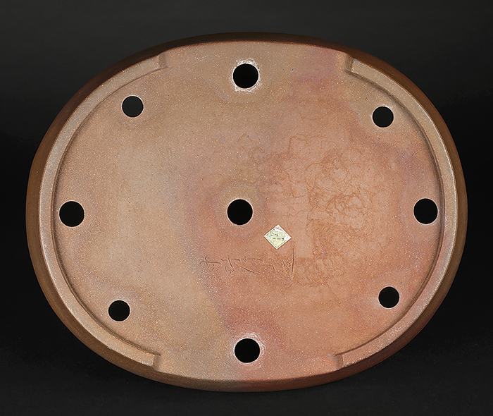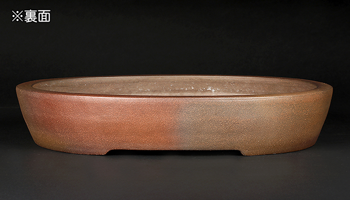 窯変によって土目の色調に変化が見られるが、これは行山がこだわる「火変わり」の妙味であり、時代が乗るごとに唯一無二の味わいを呈する。丸みを帯びた柔らかな形状が樹を上品に引き立てる手作り鉢の逸品。落款:中野行山造