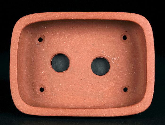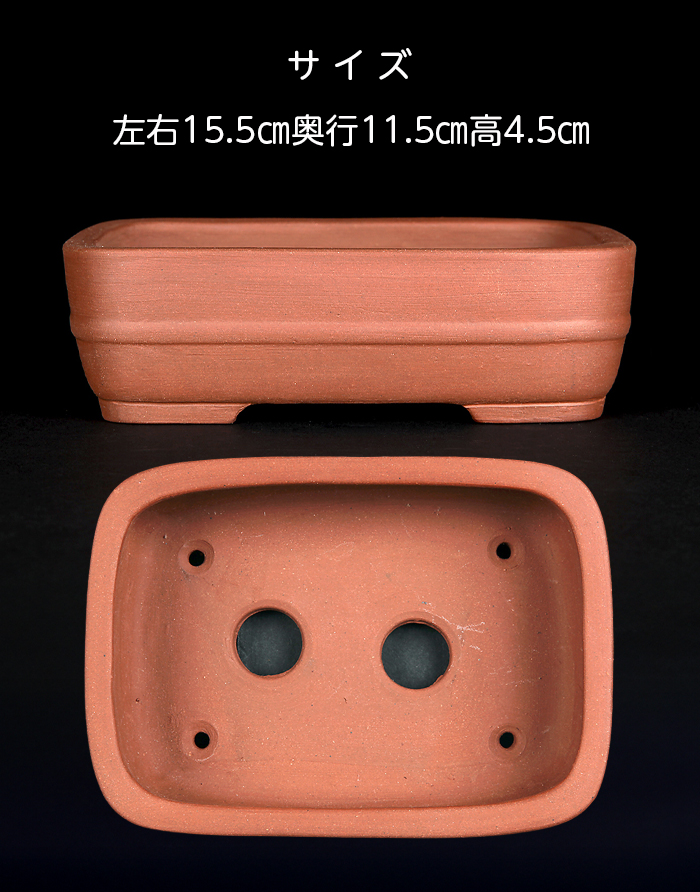 柔らかなラインの撫角型に胴紐の意匠がよく映える長方鉢。松系の優しい模様木や真柏や杜松にも使えます。サイズ感よく使い勝手の良さが魅力。