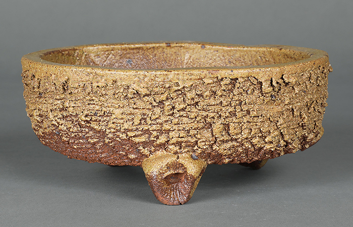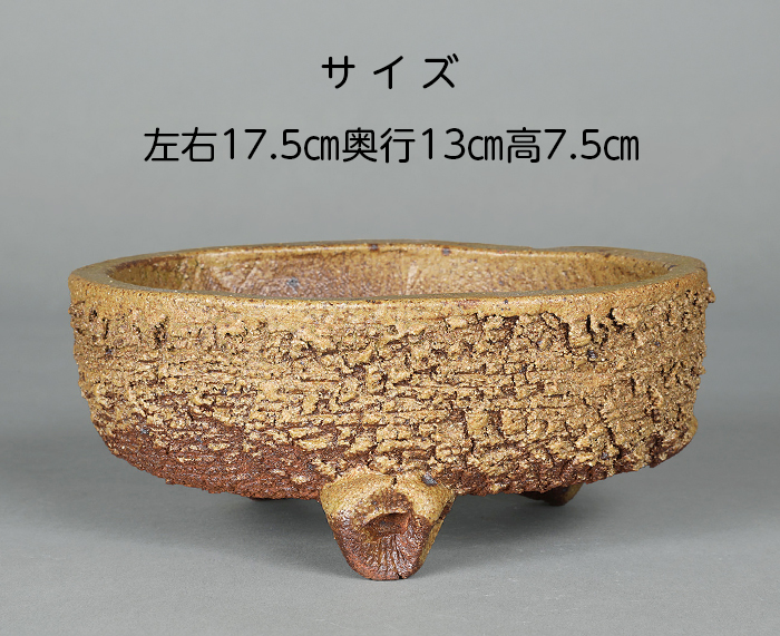 伊羅保釉は高麗茶碗の一種で侘びた佇まいと素朴な釉調が特徴です。この作品も同様に表面が粗めで黄色・茶系をベースに色調の変化が楽しめる作品です。デザインは三つ足の楕円型で素朴な味わいが魅力です。山野草の寄せ植え、創作盆栽などに最適です。