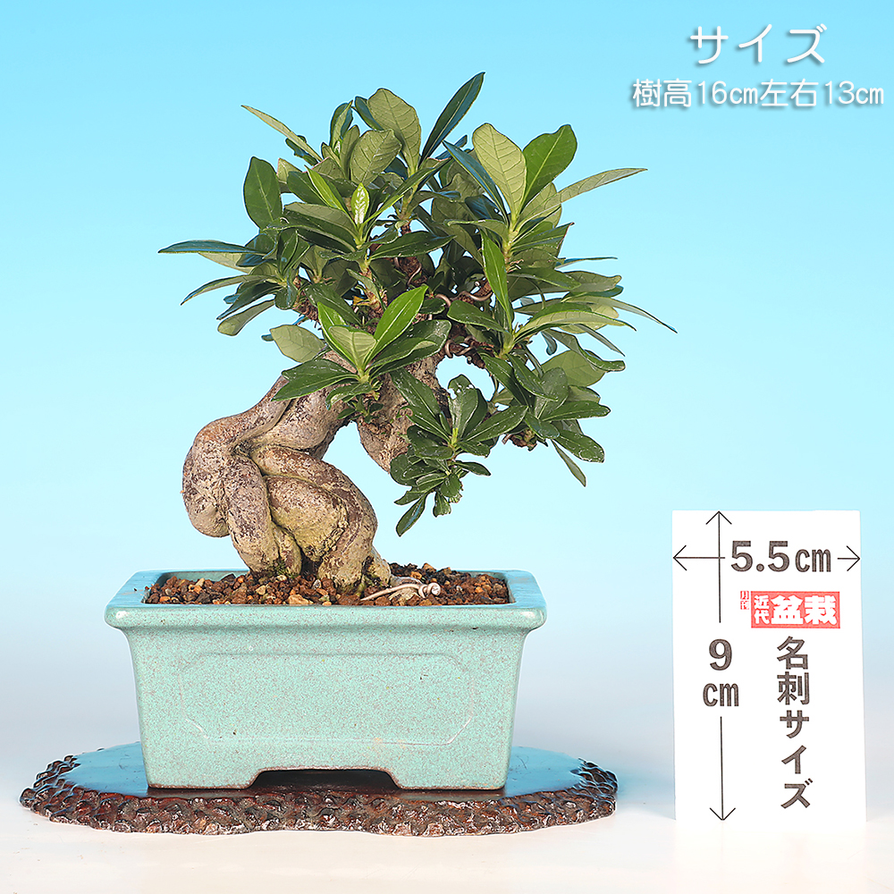 根上りの芸が魅力のくちなしの小品盆栽素材。根が癒着してゴツゴツと野趣に富んだ幹味となっています。幹肌の時代感も秀逸です。計画的に小品盆栽として作り込まれてきた素材だけにサイズ感も抜群。立ち上がりに迫力があり、幹中程の模様も見所です。この幹模様を活かして本格的な模様木に仕立てるのもよいでしょう。今年は実は成っていませんが、枝づくりを優先してもう1〜2作すれば大舞台も夢ではない逸材です。