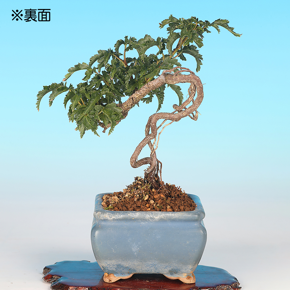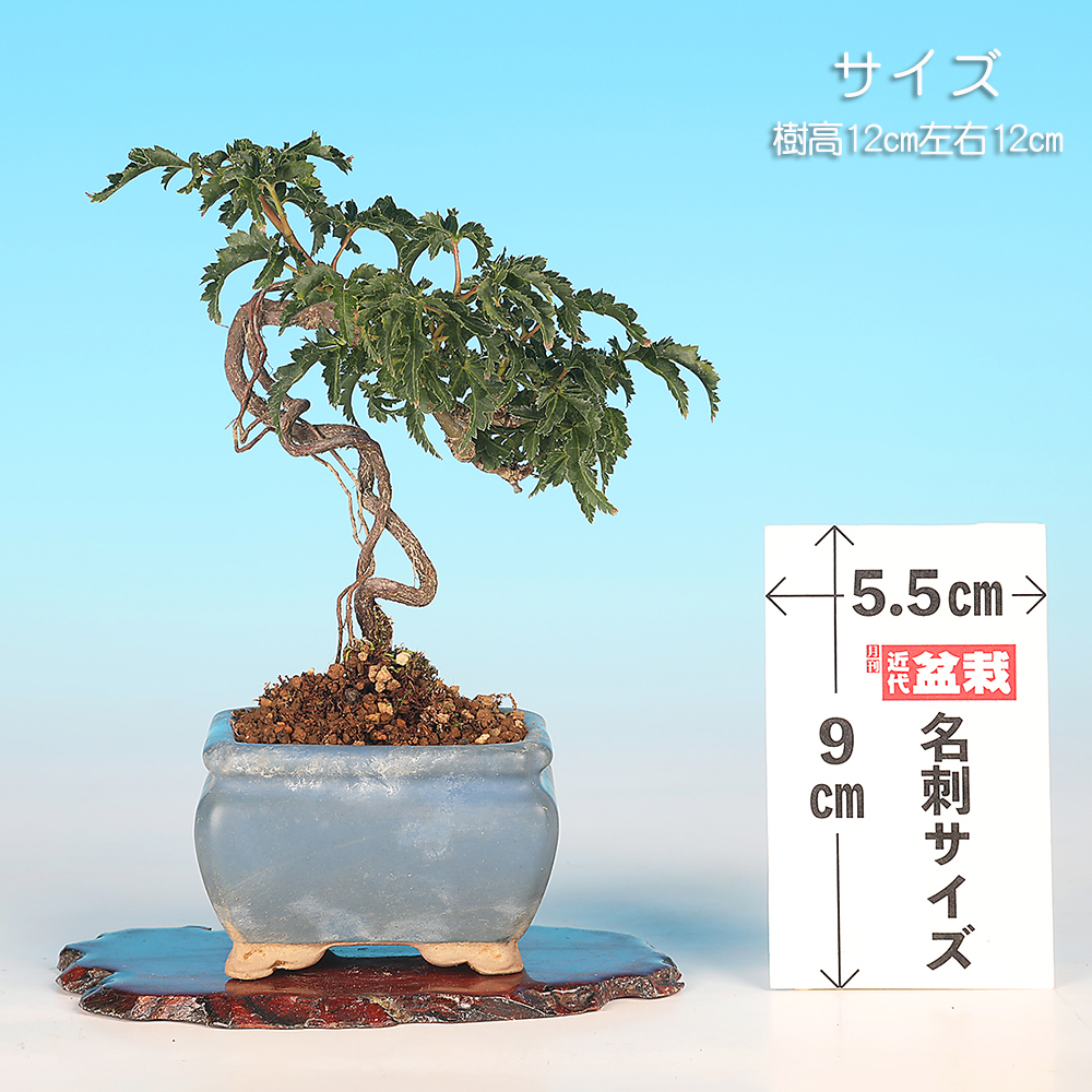 もみじ〔獅子頭〕の貴重な実生素材。これら葉性に特徴のある品種は、100%親木の性質を受け継ぐことができる挿し木で殖やすのが一般的です。ところがここに紹介した樹は実生8年生。ミニ盆栽として計画的に作り込まれた素材で根上がりの芸や細かな幹模様は、実生樹ならではの魅力が凝縮されています。掌に収まる樹高10㎝前後の寸法も極めて珍しく、ミニ盆栽愛好家必見の逸品です。