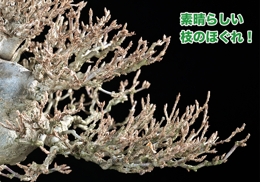 樹冠部や枝先など、樹勢が強くなりそうな部分も細やかな枝のほぐれを見せており、雑木らしい柔らかさと優雅さが感じられる。模様木の輪郭は出来上がっており、即展示可能な完成度。