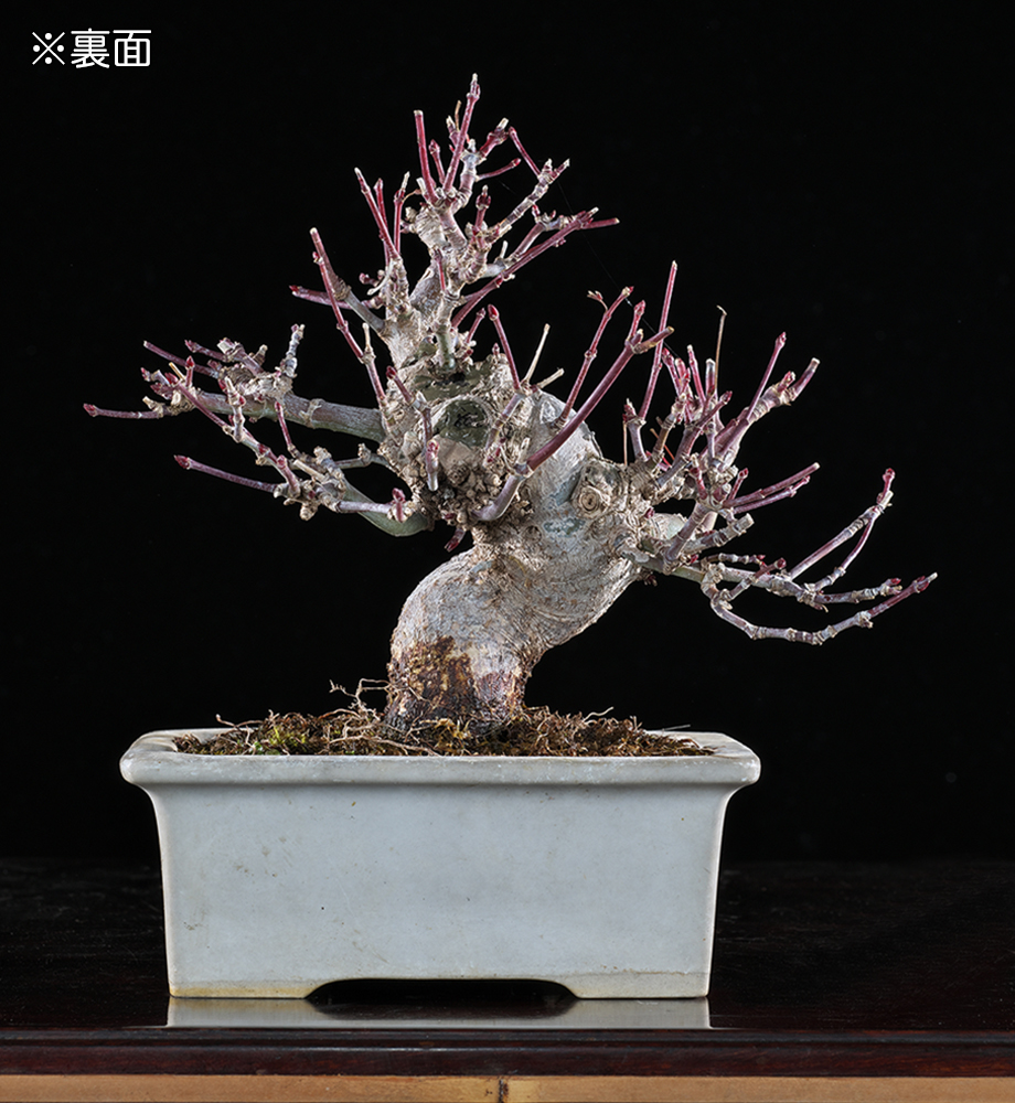 樹冠や枝骨はまだこれからという段階だが、太く充実した幹は前後左右に大きな模様が入れられており、小品の本格模様木としての素養は申し分ない。じっくりと時間をかけて小枝を作っていきたい方に最適の逸品。