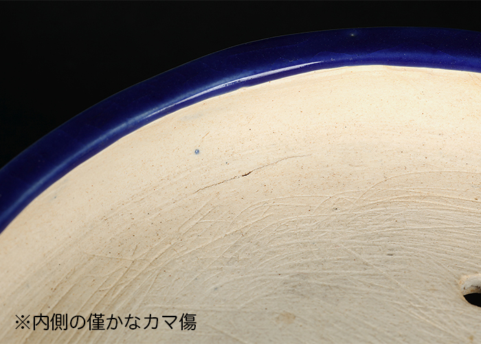 やや浅めの型ながら鉢面全体に草花文様が施され、重厚な趣を漂わせる仕上がり。落ち着いた色調の瑠璃釉も格調高い。内底に小さなカマ傷あり。落款:湖東・百間橋於・宗鳳園窯