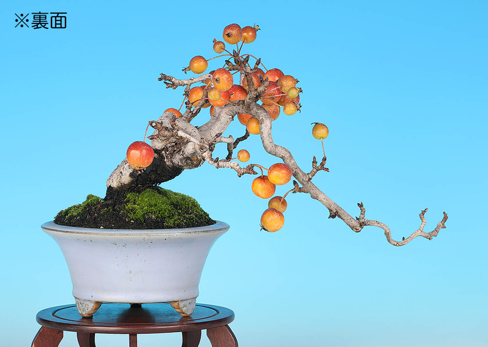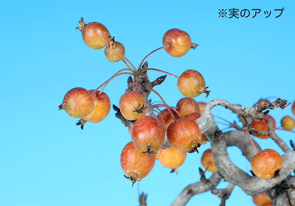 枝いっぱいに小さな実を付けた姿が愛らしく、すぐにでも鑑賞できそうな仕上がり。長く伸ばされた落ち枝も個性的で、幹肌の時代感も魅力である。来年以降の花姿や実成りの姿も楽しみな逸品。