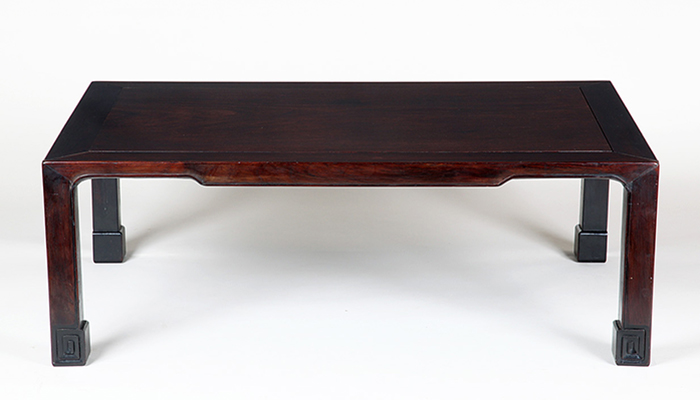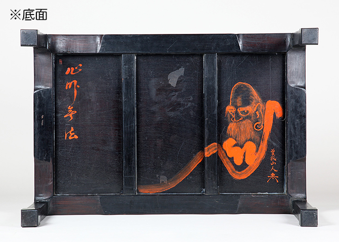 天板の裏側に朱墨で達磨図と曽我山人の署名が記されている。木目が美しい紫檀材を使った机卓で、大型の雑木と抜群の相性を誇る。軽微な補修痕あり。