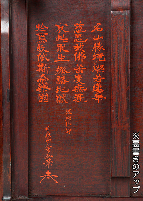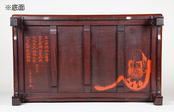 天板の裏側に朱墨で漢詩と達磨図、さらに曽我山人の署名が記されている。間口が1mを超える大型卓は非常に貴重で、間口がやや広い形状は水盤飾りの水石を飾るのに最適。天板などに使用傷あり。