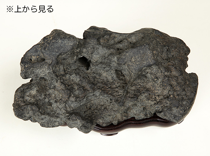 揖斐川石の特徴でもある細かな凹凸が入ったジャグレが際立つ石肌や、上部に入った抜けが厳しさを感じさせる。遠くに望む山頂の険しい岩肌か、激しく波が寄せる荒磯の景色か。台座と水盤とを使い分けて、異なる風景を楽しむのも一興。しっとりと落ち着いた石肌が味わい深い逸品。共箱付。