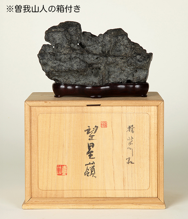 ここに紹介した水石は、著名愛石家として名高い「曽我山人(そがさんじん)」本山幸男氏旧蔵の逸品である。大阪府在住の本山氏は、丹波紫雲石を始めとして、数多くの名石を所蔵した人物として知られ、水石の見識だけではなく煎茶や文房、詩歌などに精通し、最後の文人と称された「水府散人」薄井正志氏と双璧を為すとも言われる水石界の重鎮である。石質や産地などに強いこだわりを持ち、その卓越した審美眼で見出された水石の数々は、そのほとんどが未公開に近い形で秘蔵されており、まさしく知る人ぞ知る「幻の名石群」。前回ご紹介した時にも大反響を得た水石愛好家垂涎の逸品を、特別価格にてご奉仕。この機会にぜひ!