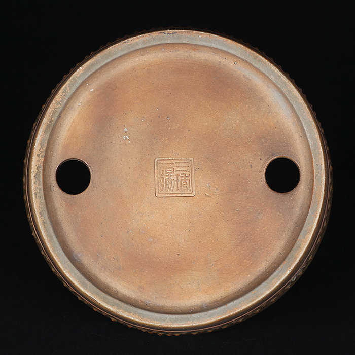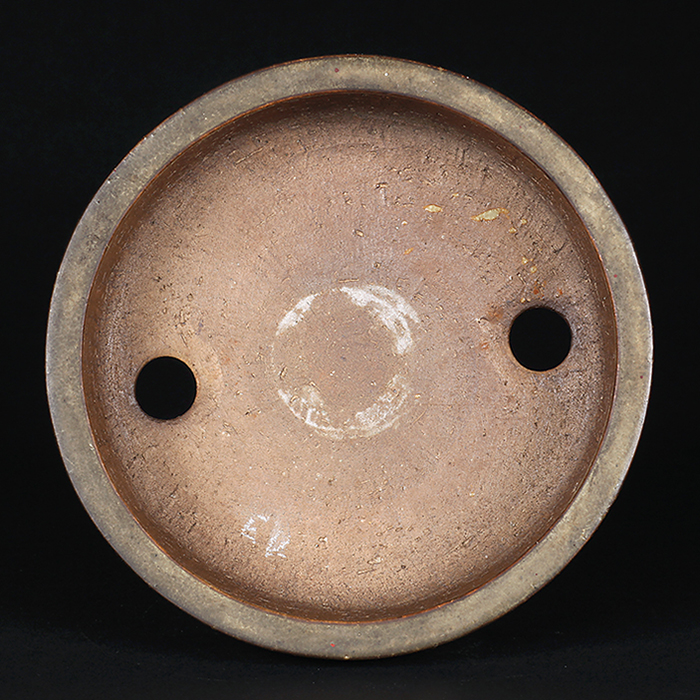 鋲打丸鉢としては深さがあり、大変珍しい型。かなり古い時代に焼成された作品のようで、元の色調が分からなくなるほどの時代乗りを見せる。縁に小さなホツレあり。水抜き細工なし。落款:三琇一陽