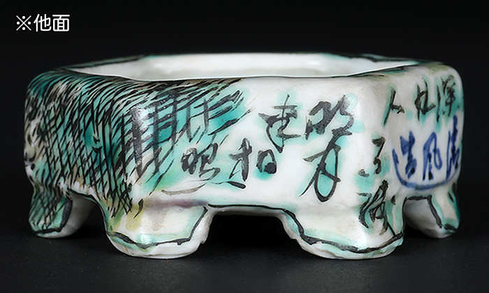 ざっくりとした成型と、太めの線と大胆な構図で描く清風独特の意匠が堪能できる作品。清風盆器は数が少なく、ミニ盆栽クラスの鉢が二枚揃って継承されていることに驚かされる。近年、清風盆器が再評価のきざしを見せており市場に流通することも稀な貴重品。木箱付。落款:清風造(二枚とも)かみを感じさせる。縁に小さなホツレあり。木箱付。落款:東福寺