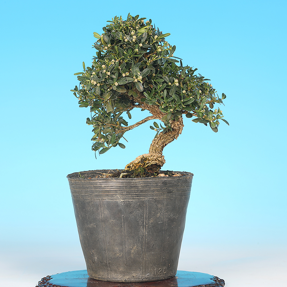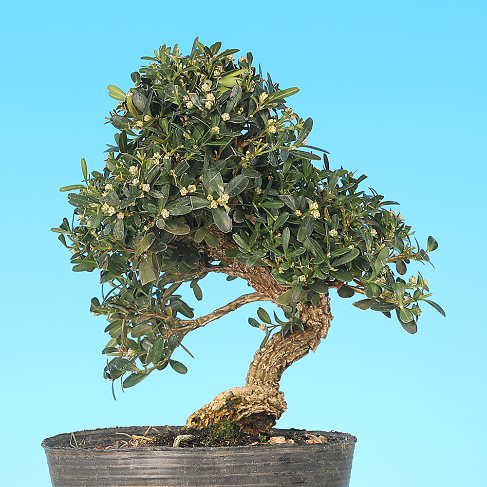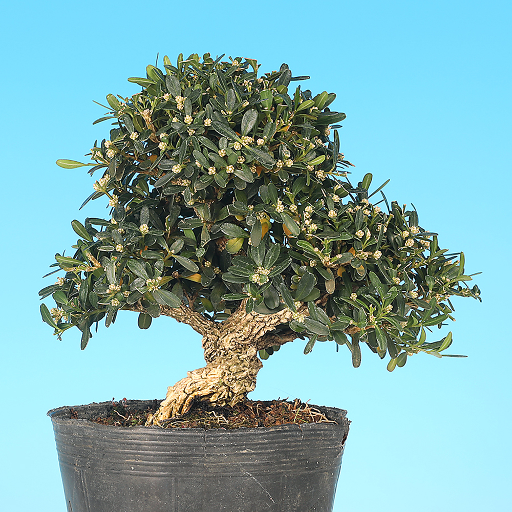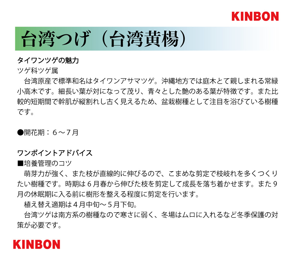 台湾原産で標準和名はタイワンアサマツゲ。沖縄地方では庭木とて親しまれる常緑小高木です。細長い葉が対になって茂り、青々とした艶のある葉が特徴です。また比較的短期間で幹肌が縦割れし古く見えるため、盆栽樹種として注目を浴びている樹種です。