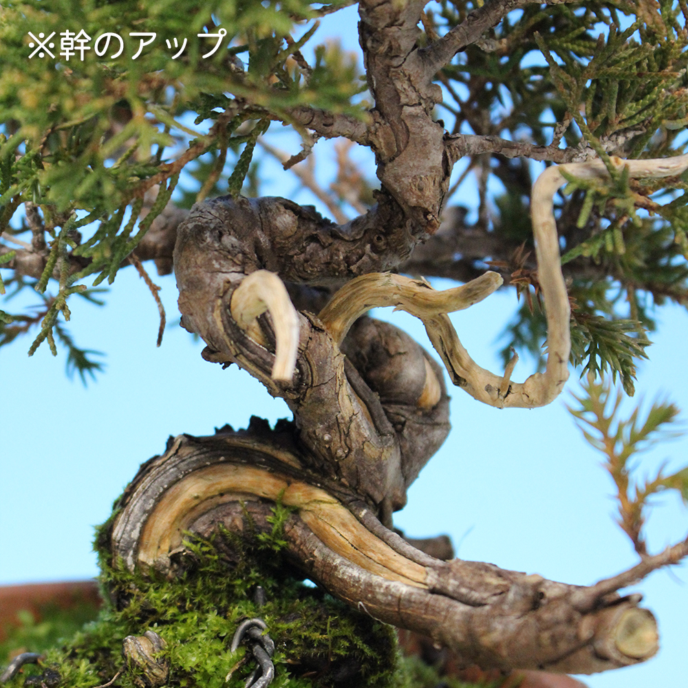 挿し木から計画的に仕立てられてきた真柏の有望素材です。葉性も素晴らしく、糸魚川系だと思われます。この太さ・この幹模様が何よりの魅力。将来の名品を目指して樹づくりを楽しんで下さい。
